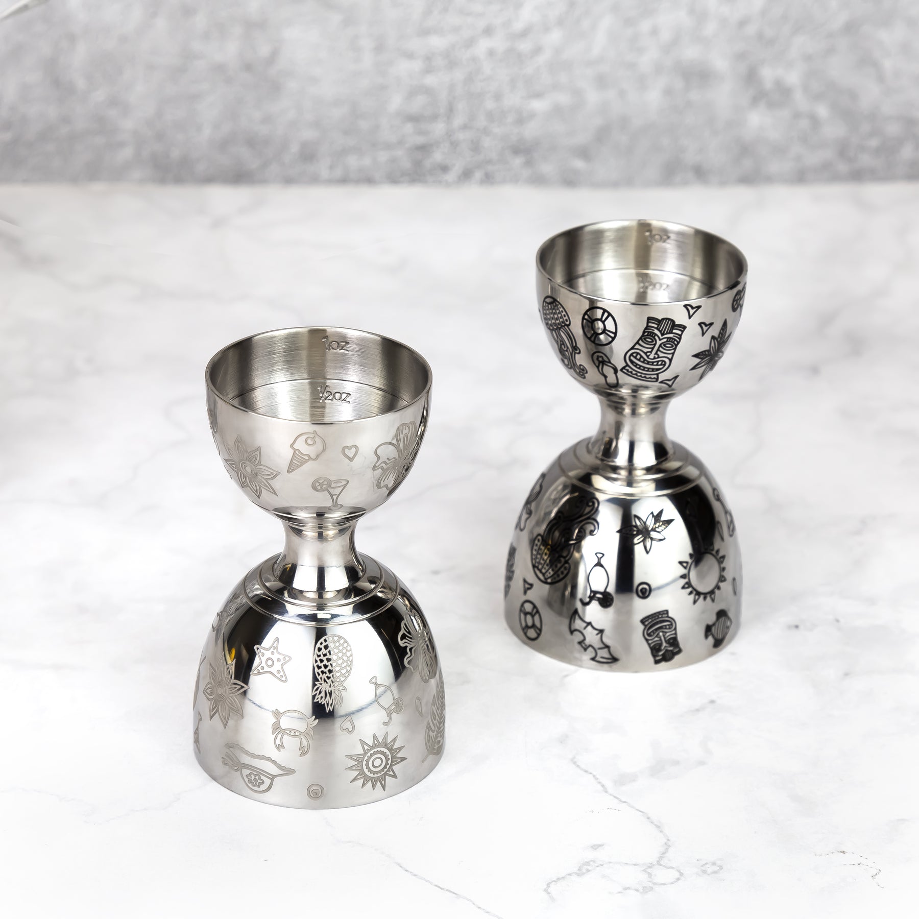 Mejora tu experiencia en coctelería con nuestro medidor de cócteles de doble extremo, exquisitamente elaborado, que combina la precisión de la medición con la maestría tropical. Fabricado meticulosamente en acero inoxidable S/S#304 de grado alimenticio, este medidor en forma de campana combina funcionalidad profesional con una atractiva elegancia de inspiración tiki. Su exterior pulido a espejo deslumbra en cualquier barra, mientras que su interior esmerilado con marcas de medición grabadas a láser (1 oz, 2 oz, más incrementos de ½ oz y 1½ oz) garantiza una precisión milimétrica en cada vertido. Simplemente gira el medidor entre los dos extremos o usa el diseño de agarre para medir sin esfuerzo, lo que lo convierte en la herramienta perfecta para crear cócteles clásicos, bebidas tropicales o creaciones de coctelería modernas. Elige entre nuestro elegante acabado espejo o grabado con relleno negro, o personalízalo con tu propio diseño para un artículo esencial de bar verdaderamente único.