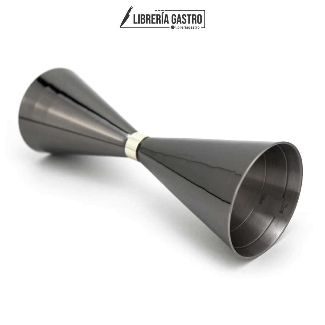 Este jigger lleva muchos años en el mercado japonés y es muy popular entre los cocteleros de ese país. Con vasos de boca ancha para verter y medir fácilmente, este es el medidor más grande que importamos con capacidad de 2 y 3 onzas (y una práctica línea de 1,5 onzas). Todo ceñido con una sexy cintura con detalles dorados.